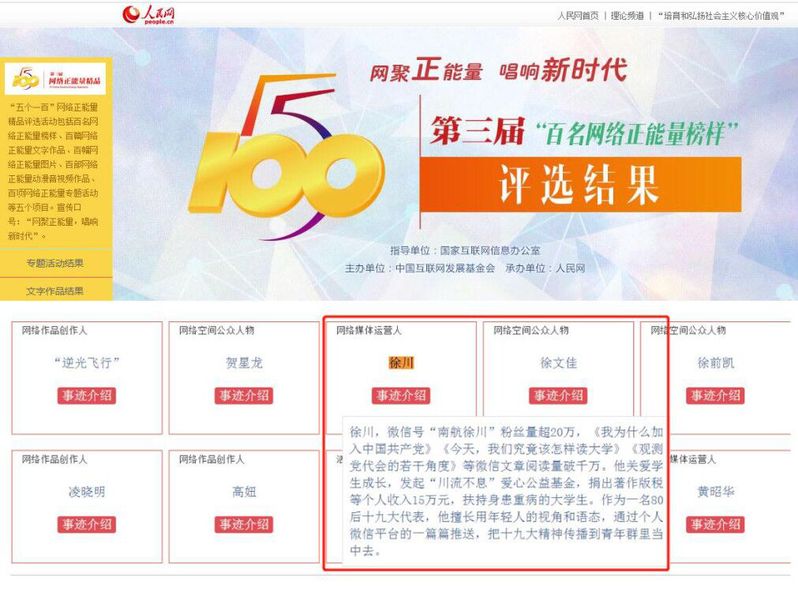 11月21日,由国家互联网信息办公室指导,中国互联网发展基金会主办,人民网、央视网、中国青年网、中国新闻网、环球网共同承办的第三届“五个一百”网络正能量精品评选活动结果揭晓,永利官网教师徐川获评全国“百名网络正能量榜样”。这也是继2016、2017后,徐川连续第三年获此殊荣。与此同时,由我校和新华社共同制作的视频作品《7分钟速览中国共产党96年的辉煌历史》获评全国“百部网络正能量榜样音视频”。