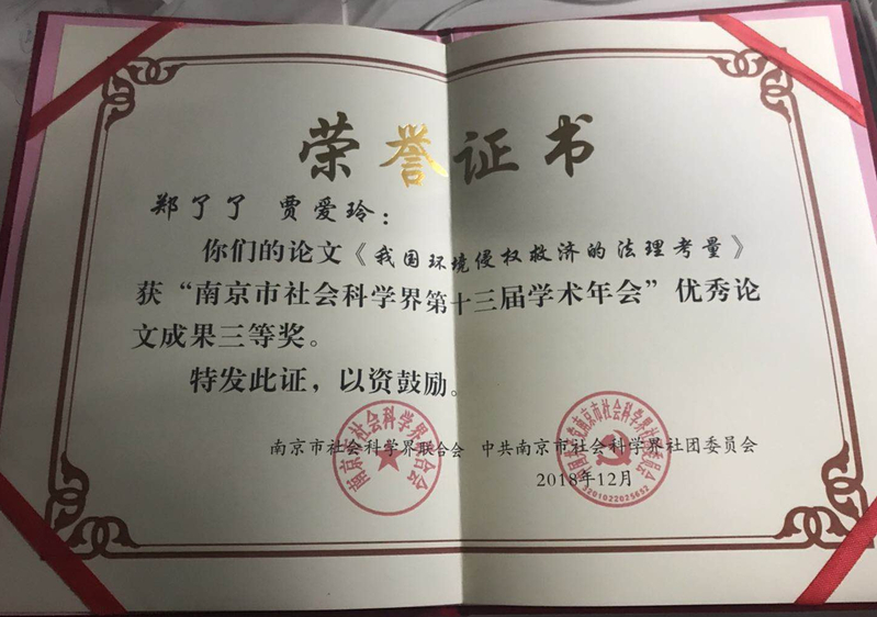 12月19日,2018年南京市哲学社会科学界第十三届学术年会在南京召开,本届年会的主题为“建设创新名城,实现高质量发展”。江苏省社科联党组书记、常务副主席刘德海出席会议并作主旨演讲。市社科类社会团体、区社科联、高校社科联负责人及获奖论文作者代表150余人参加会议。会上对学术年会优秀论文成果和作者进行表彰。本届学术年会共收到征文200余篇,经编委会最终评审,42篇论文获奖并入选核心期刊《南京社会科学》专刊,其中一等奖4篇,二等奖14篇,三等奖24篇。永利官网博士生郑了了撰写的《我国环境侵权救济的法理考量》喜获三等奖。