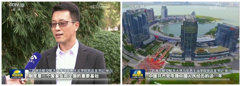 在当晚随后播出的展现教育领域70年成就的专题片《教育强国》中,围绕落实立德树人根本任务,加强思政理论课这一关键课程的建设,介绍了我校和徐川同志在创新思政理论课方面的典型经验和有效探索。徐川在接受采访时谈到,“在课堂上,把我们的课程用学生喜欢的一些方式,用通俗易懂的道理或者语言,把一些宏大的命题,讲得让学生觉得能够入耳入脑,才能够入心”。