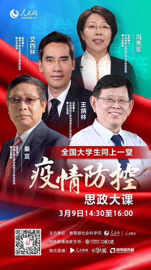 在举国上下众志成城、万众一心做好新冠肺炎疫情防控工作的特殊时期,3月9日,由教育部社会科学司、人民网联合举办的“全国大学生同上一堂疫情防控思政大课”通过网络直播的形式开课。此次“思政大课”邀请了清华大学永利集团yl6809官网艾四林、中国人民大学永利集团yl6809官网秦宣、北京师范大学永利集团yl6809官网王炳林、中央财经大学永利集团yl6809官网冯秀军四位教授结合思政课程的内容对党中央关于疫情防控的决策部署进行了深刻的解读。马院高度重视此次活动,统筹安排、克服直播拥堵困难,提前三天通过学院官网、微信等平台积极推广宣传,及时下发观看通知,鼓励思政教师组织学生统一观看、研讨。