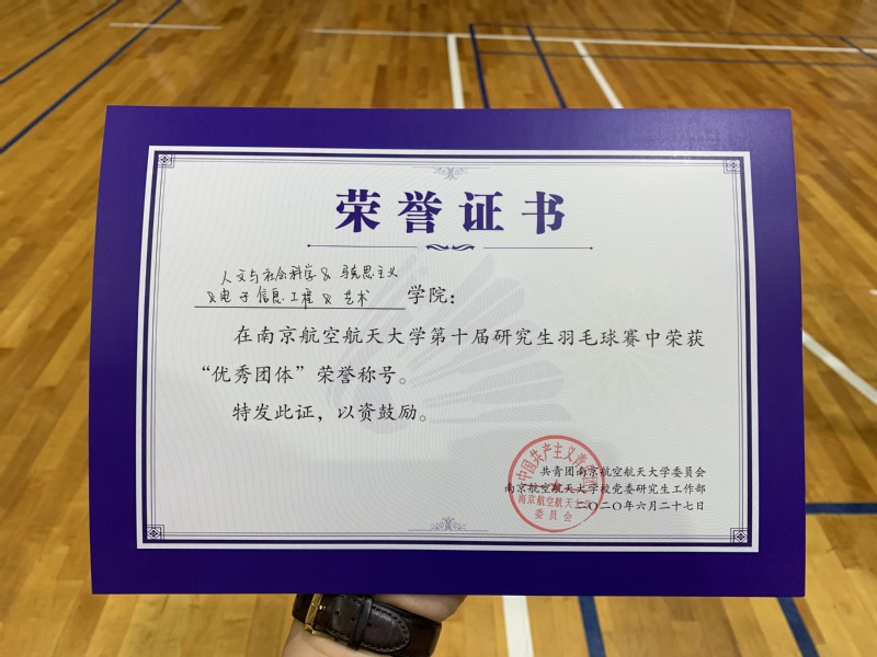 6月26日、27日,永利集团yl6809官网第十届研究生羽毛球赛在将军路校区东区体育馆举行。经过两天的角逐,永利官网与电子信息工程学院、人文与社会科学学院、艺术学院联合组成的参赛队伍成功进入8强,在比赛中荣获“优秀团队”称号。