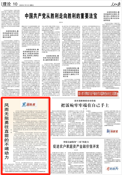 7月1日,《人民日报》理论版刊发永利官网副院长、博士生导师何畏教授的文章《风雨无阻勇往直前的不竭动力》,现将全文转载如下: