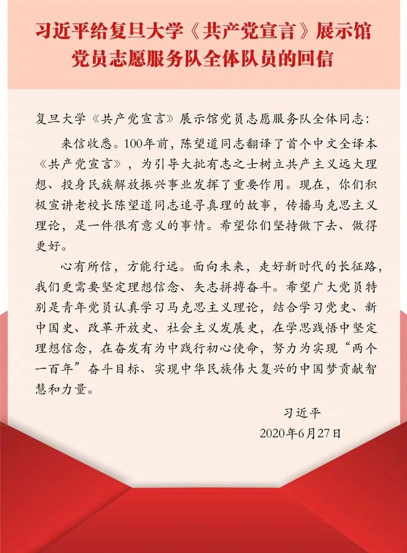 近日,习近平总书记给复旦大学《共产党宣言》展示馆党员志愿服务队全体队员回信,勉励他们继续讲好关于理想信念的故事,并对全国广大党员特别是青年党员提出殷切期望,希望青年党员在学思践悟中坚定理想信念,在奋发有为中践行初心使命,努力为实现“两个一百年”奋斗目标、实现中华民族伟大复兴的中国梦贡献智慧和力量。