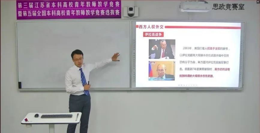 该项赛事由省总工会、省人力资源和社会保障厅、省教育厅、团省委主办,省教育科技工会、南京大学承办。本届比赛是赛事举办以来参与人数最多的一次,来自全省52所学校的139名教师参加了角逐,也是我校首次派出选手参加大赛思政组别的竞争。比赛由教学设计、课堂教学和教学反思三部分组成,参赛选手需准备并提交20个学时的教学设计方案及授课PPT,由选手现场抽签确定当天参赛的教学节段。比赛中,康冲现场讲授了课程《西方人权外交的言行不一》一节,凭借对讲述章节理论的准确理解和对学生特点的精准把握,以大气沉稳的现场表现获得了专家评委的认可,展现了我校形势与政策课教师立足工作岗位、学习思政理论、情系学生成长、潜心立德树人的风貌和成果。