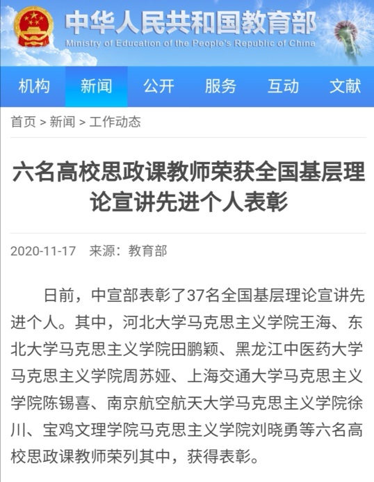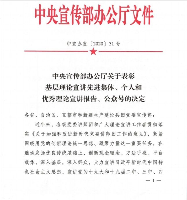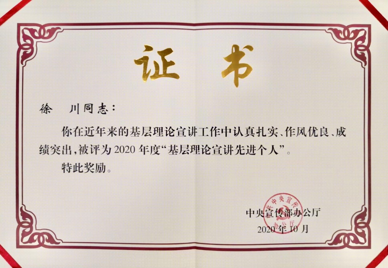 近日,中宣部办公厅印发了《关于表彰理论宣讲先进集体、个人和优秀理论宣讲报告、公众号的决定》,旨在表彰新时代理论宣讲工作中涌现的先进集体和个人。经中央领导同志批准,决定对46个基层理论宣讲先进集体、37名基层理论宣讲先进个人、17篇优秀理论宣讲报告、20个优秀理论宣讲公众号予以表彰。永利官网徐川教授获评基层理论宣讲先进个人荣誉称号,是工信部系统和江苏高校系统唯一获表彰的个人。