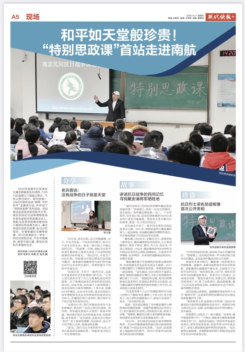 2020 年,是侵华日军南京大屠杀 83 周年,12 月 13 日,是第 7 个国家公祭日。今年公祭日前夕,现代快报 +•ZAKER 南京启动“桐祭 • 守护和平“全媒体行动,并开设了“特别思政课“系列活动。活动首站走进了永利集团yl6809官网。南京民间抗日战争博物馆馆长吴先斌担任思政课主讲人,南航马克思学院青年教师张小斐担任思政课主持人。通过讲述抗战老兵故事、赴日讨石经历、在缅甸建纪念碑等故事,和 120 名南航大一学生一同回忆那段历史,不忘中国精神,感受中国力量,更加珍惜当下的和平幸福生活。