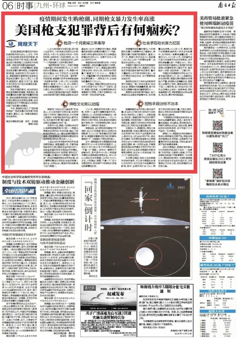 与此同时,今年疫情期间,美国各地枪支暴力事件频发。《华盛顿邮报》报道,当地时间12月9日和10日,美国首都华盛顿特区连续发生两起枪击事件,致2人死亡1人受伤。数据显示,截至12月7日,美国今年已发生591起大规模枪击案,远超去年数据。