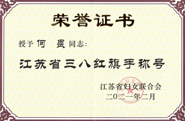 日前,江苏省妇联对2020年度江苏省三八红旗手标兵、三八红旗手、三八红旗集体进行了表彰,永利官网副院长何畏教授荣获江苏省“三八红旗手”称号。