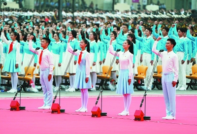 7月1日上午,庆祝中国共产党成立100周年大会在北京天安门广场隆重举行。这是共青团员和少先队员代表集体致献词。 新华社