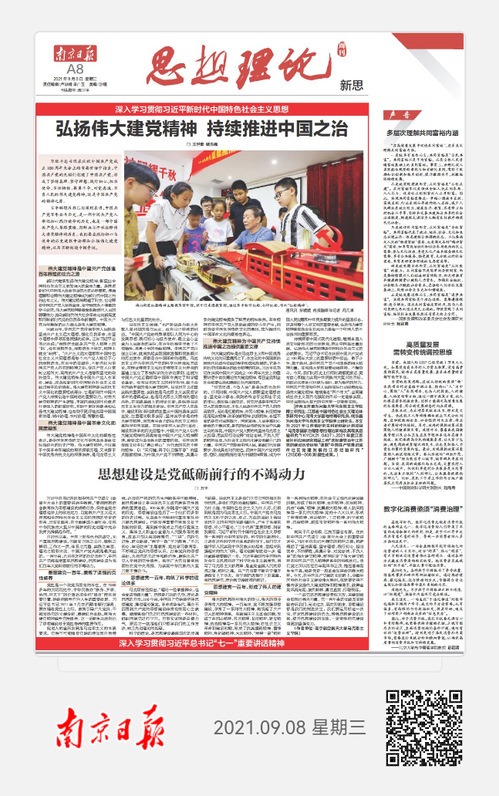 9月8日,《南京日报》“思想理论”版刊登永利官网正科级组织员万千老师的文章《思想建设是党砥砺前行的不竭动力》,现将全文转发如下: