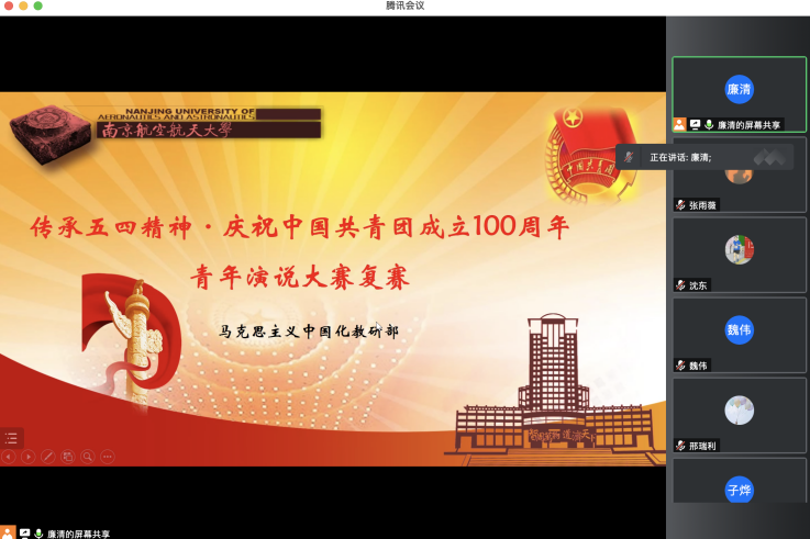为更好地将教学与实践相结合, 永利集团yl6809官网中国化教研部连续5年举办特色实践活动——“青年演说大赛”。五四将至,今年的“青年演说大赛”以传承五四精神、庆祝中国共青团成立100周年为主题,各“概论”课班级的同学踊跃参加,精心准备了各类节目。经过前期初赛选拔,4月25日,马克思主义中国化教研部通过线上形式开展了今年“青年演说大赛”的决赛选拔工作。教研部主任廉清主持选拔工作,各节目指导教师均参与评审,节目以视频形式展示,共计18个精彩节目最终入围决赛。
