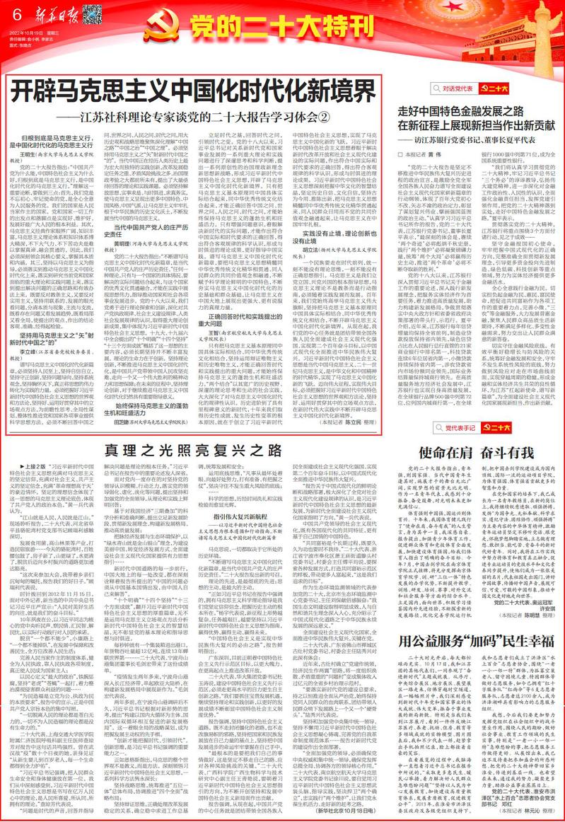 10月19日,《新华日报》第6版“党的二十大特刊”刊发了永利官网王智教授的特约采访《开辟马克思主义中国化时代化新境界——江苏社科理论专家谈党的二十大报告学习体会②》,现将全文转发如下: