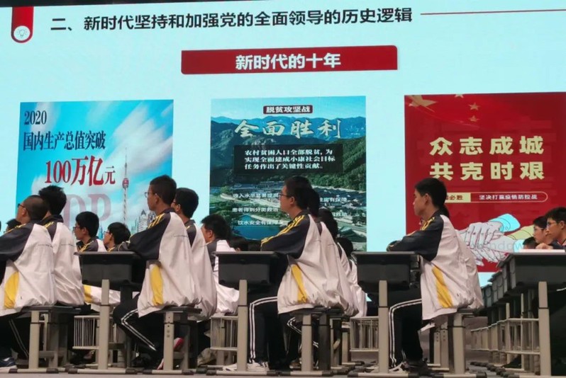第二节课,溧阳中学陈昕老师的教学内容是《坚持和加强党的全面领导》。课堂按照“为什么、如何做”的逻辑结构展开,通过班级各小组展示研学成果,引导学生逐步探寻出百年大党成功执政的奥秘,随后通过展示十四五规划编制过程,帮助学生理解党的领导是中国特色社会主义制度的最大优势,增强高中生对中国共产党的情感认同。