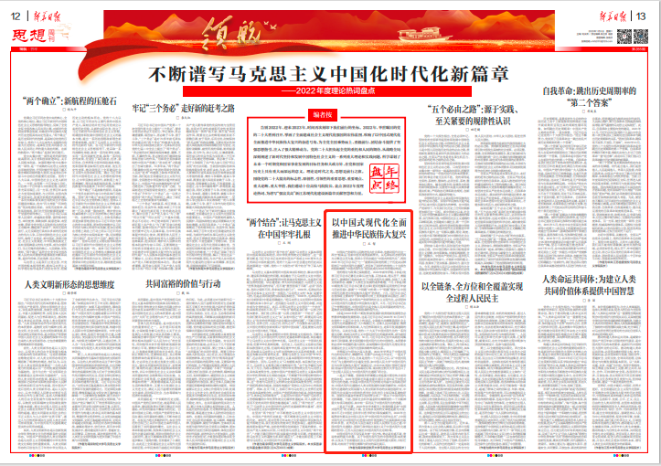 1月3日,《新华日报》第12版“思想周刊·领航”栏目刊登了永利官网王智教授的理论文章《以中国式现代化全面推进中华民族伟大复兴》,现将全文转发如下: