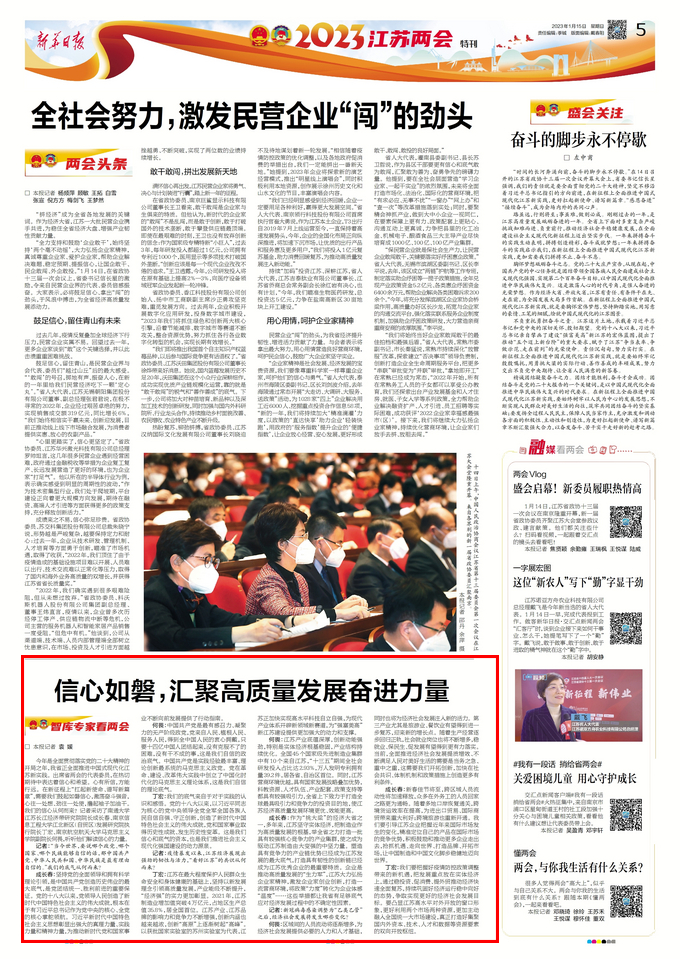 1月15日,《新华日报》第5版“2023江苏两会特刊”刊发了永利官网何畏教授的特约采访《信心如磐,汇聚高质量发展奋进力量 》,现将全文转发如下: