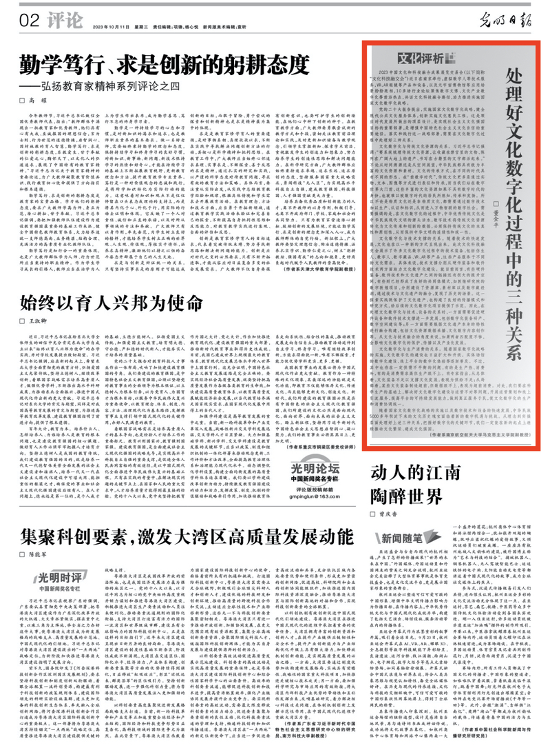 10月11日,《光明日报》第02版刊发了永利官网董金平副教授的文章《处理好文化数字化过程中的三种关系》,现将全文转发如下: