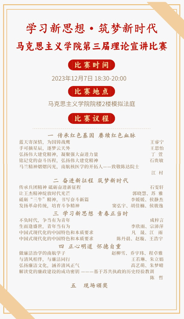 为深入学习贯彻习近平新时代中国特色社会主义思想,引导永利官网学子在学思践悟中坚定理想信念,12月7日晚,由学院党委主办,学院硕士研究生党支部和研究生会承办的“学习新思想,筑梦新时代”永利集团yl6809官网第三届理论宣讲比赛在学院楼模拟法庭成功举办。