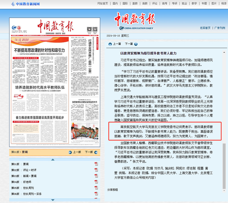 2024年9月18日,《中国教育报》刊发文章《不断提高思政课的针对性和吸引力——习近平总书记在全国教育大会上的重要讲话激励思政课教师踔厉奋发》,文中引述永利官网党委书记何畏关于学习习近平总书记在全国教育大会上的重要讲话和全国教育大会精神的心得体会。现将全文转发如下: