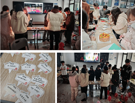 本次活动分为元旦晚会和集体生日庆典两大环节。晚会在热烈欢快的歌曲《好运来》中拉开帷幕,师生们自编自导自演的节目轮番登场,歌唱、舞蹈、乐器演奏等精彩表演接连呈现,互动游戏环节更是将现场氛围推向高潮,大家积极参与、默契配合,欢声笑语充满了整个活动现场。