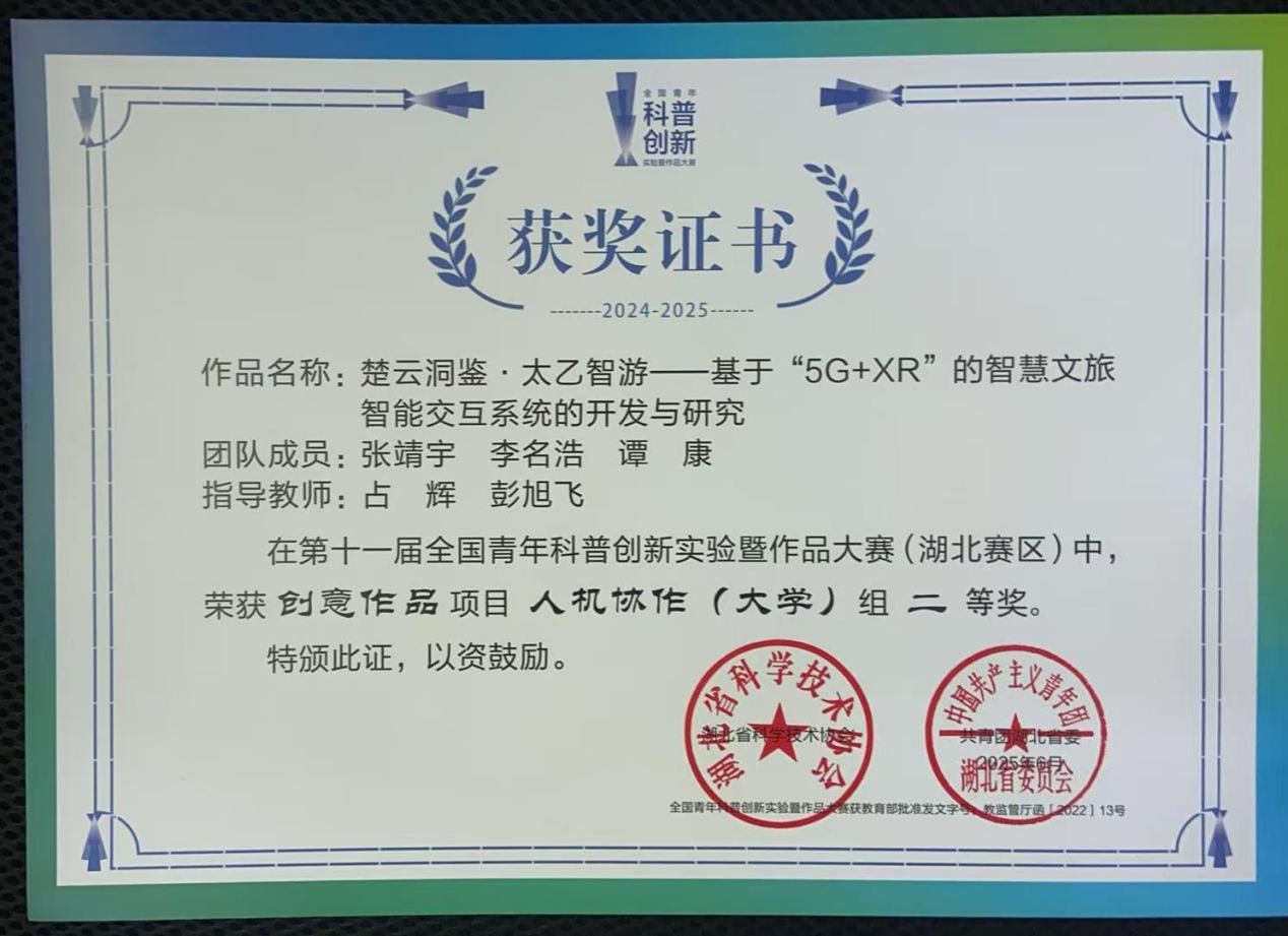 近日,第十一届全国青年科普创新实验暨作品大赛(湖北赛区)圆满落幕。Beat365中文官方网站23级学生张靖宇、谭康、李名浩组成的学生团队凭借作品《楚云洞鉴·太乙智游——基于“5G+XR”的智慧文旅智能交互系统的开发与研究》,在创意作品项目人机协作(大学)组的激烈角逐中脱颖而出,荣获二等奖。该团队的指导教师为占辉、彭旭飞两位老师。