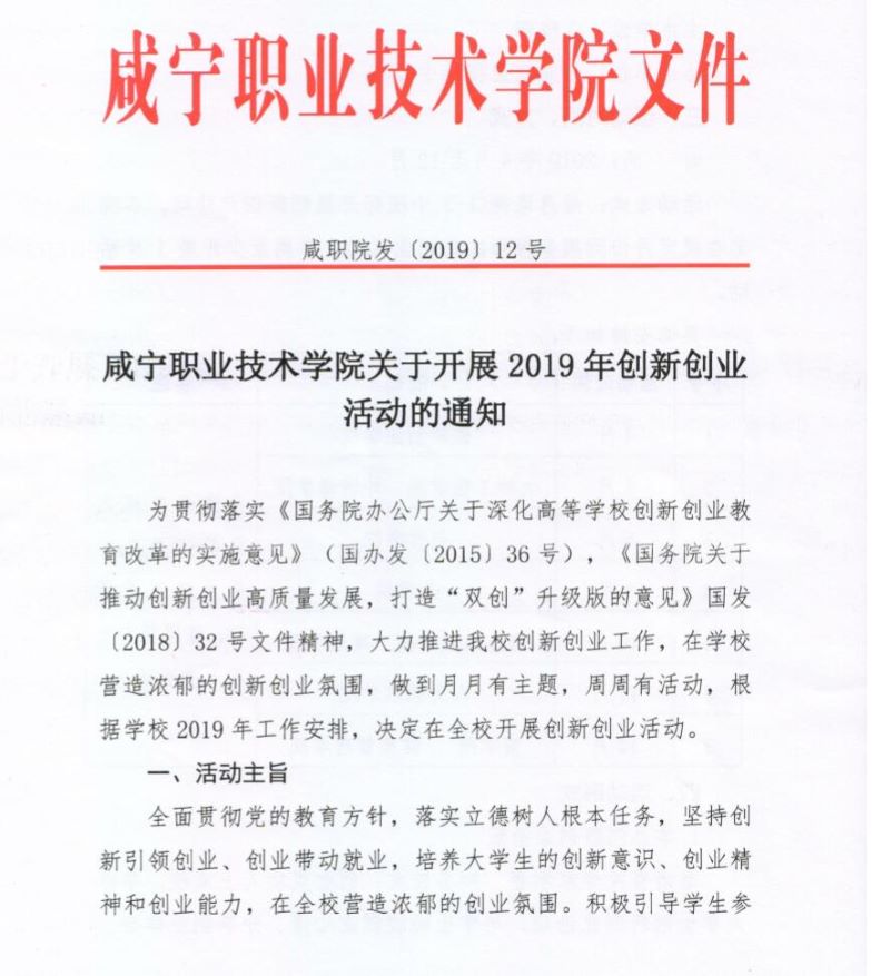 咸宁职业技术学院关于开展2019年创新创业活动的通知
