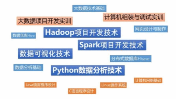 Java程序设计、Web前端技术、Python程序设计、数据库应用技术、数据采集技术、Hadoop大数据开发与应用、Spark技术与应用、数据挖掘应用、大数据平台部署与运维等。