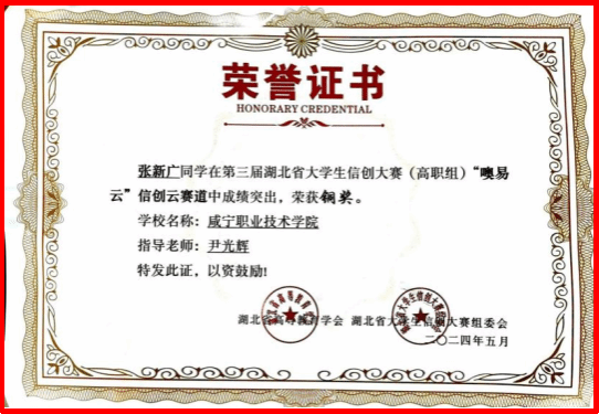 2021级毕业生,2021年参加新华三杯全国大学生数字技术大赛获三等奖,现就职于湖北华育智远信息科技有限公司,任高级网络工程师,月薪20000。