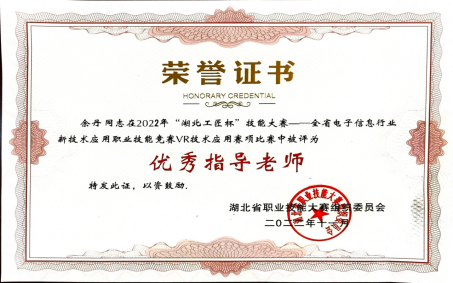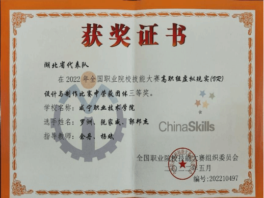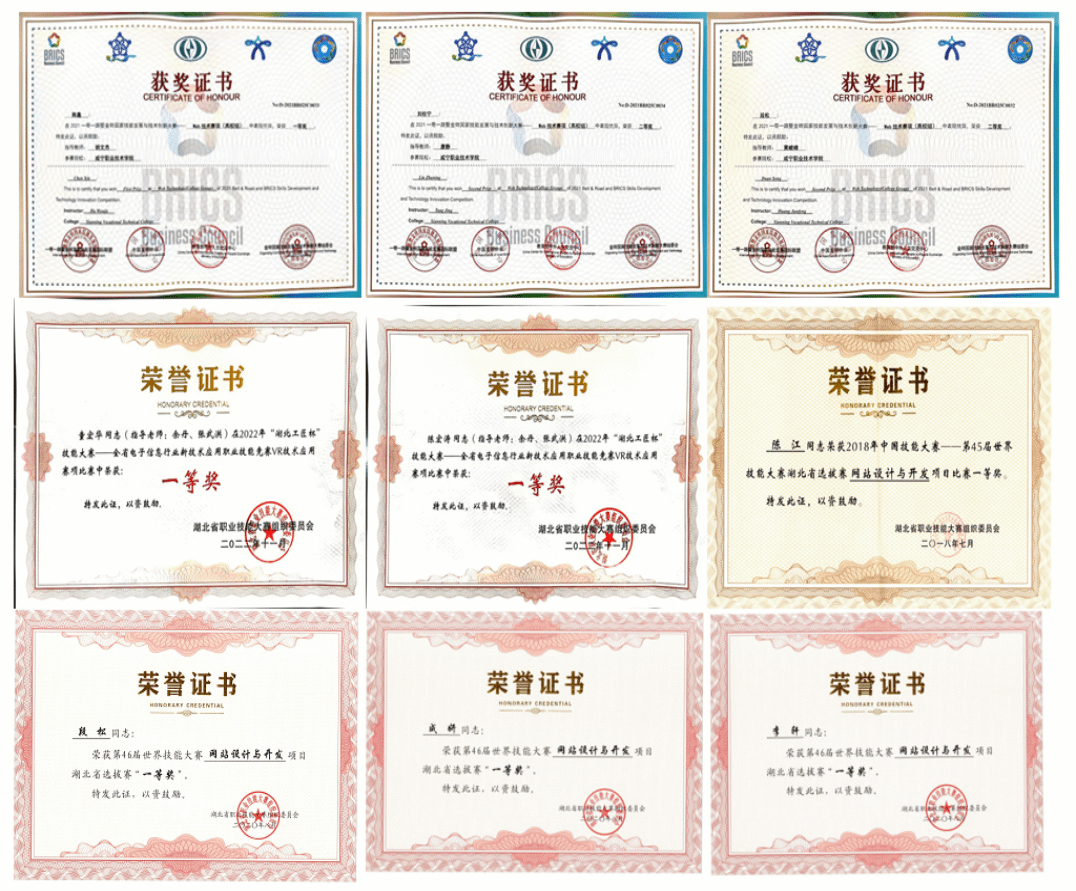 积极参加各类技能大赛,培养出了一批优秀学生,在45和46届世界技能大赛“网站设计与开发”赛项中获得省级一等奖4项,三等奖2项,一人代表湖北省参加全国选拔赛,并入围国家集训队,2人次教师获得人社厅授予的“优秀指导老师”称号,2名学生获得人社厅授予的“湖北省技术能手”称号。在“一带一路暨金砖国家技能发展与技术创新技能大赛”中获全国赛特等奖一人,一等奖2人,二等奖2人,三等奖3人。本专业积极推进课赛融合,学生获得全国职业院校技能竞赛(高职组)“手机移动应用开发”赛项二等奖,(高职组)“虚拟现实(VR)设计与制作”赛项三等奖;各行指委、教指委等行业赛20项;各类创新创业大赛2项;教学能力大赛2项;获取高级职业技能证书教师比例达100%。