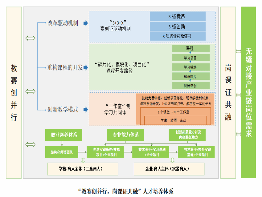 为了提高计算机应用技术专业学生的动手实践和创新能力,积极开展“三级”技能训练,即校级、省级、国家级技能大赛;“三级”创新训练活动,即校级创新项目、省大学生创新创业训练计划、“互联网+”大学生创新创业大赛;以及人社部门、知名企业颁发的X证书。通过技能大赛的技能训练、创新创业意识的培养、X 证书的获取三重驱动,鼓励学生“做中学、学中做”,有效激发学生的学习动力,既满足职业院校学生侧重实践教育的特性,又保障学生的多元发展需求。